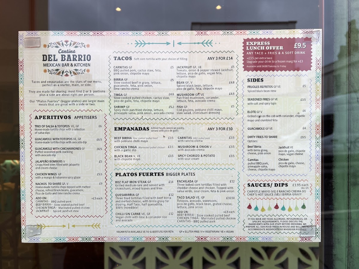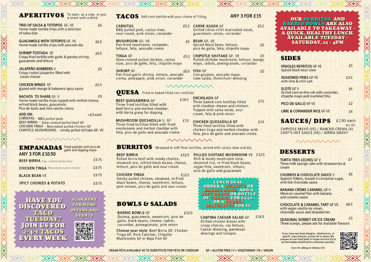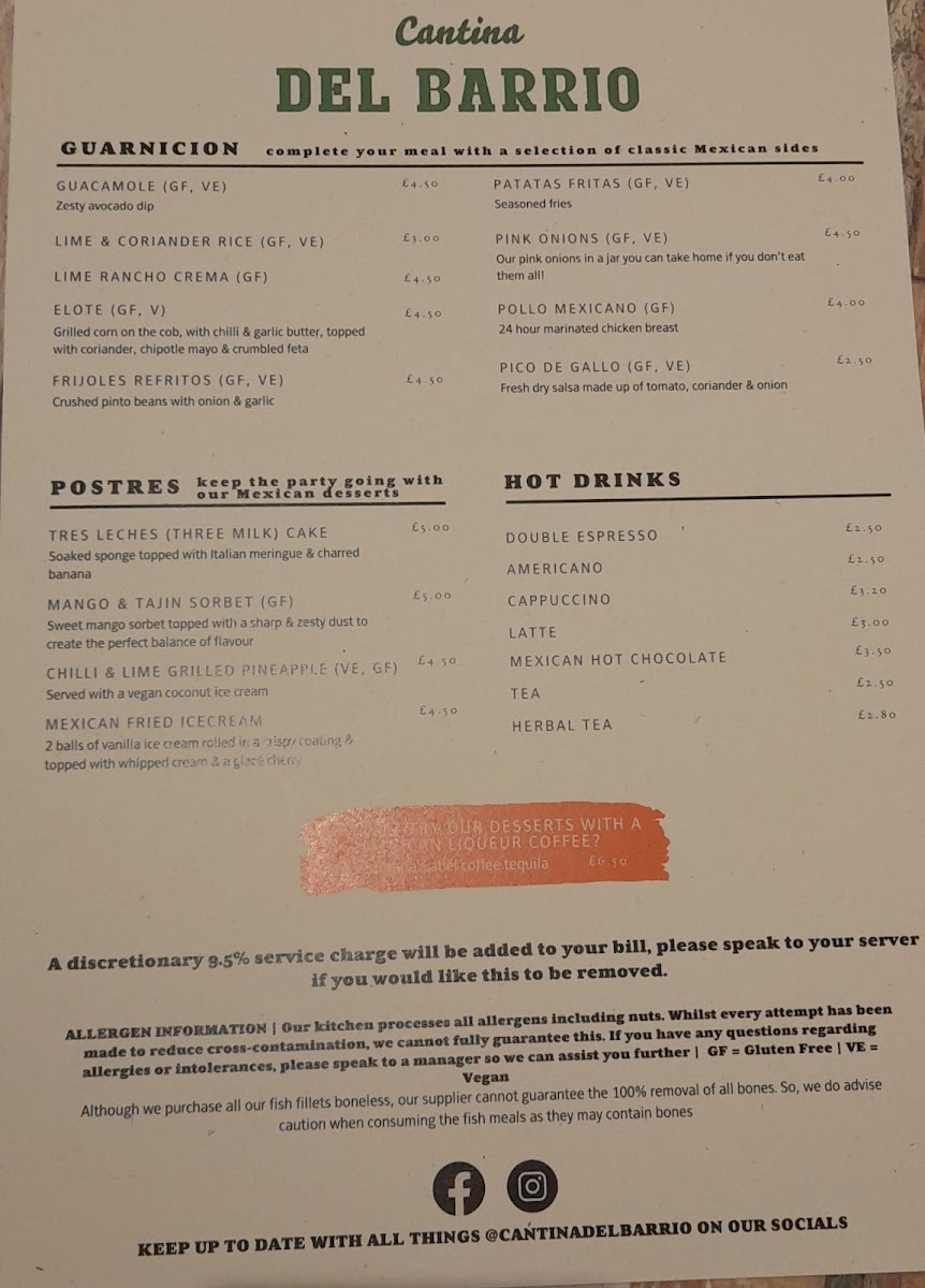 Cantina Del Barrio offers a vibrant and diverse menu with a range of mouthwatering dishes and refreshing drinks. For starters, the Trio of Salsa & Totopos (GF, VE) and Guacamole with Totopos (GF, VE) are popular choices, alongside Shrimp Tostada (GF) and Jalapeño Bombers (V). The taco selection features flavorful options like Carnitas, Carne Asada (GF), and Mushroom (GF, V), while the quesadillas include Beef Quesabirria (GF) and Chicken Quesadilla (GF). Those looking for something hearty can enjoy a Burrito, with fillings such as Beef Birria and Pulled Shiitake Mushroom (VE). For sides, the Frijoles Refritos (GF, VE) and Seasoned Fries (GF, VE) perfectly complement any meal. To wash it down, the drink menu features a range of Margaritas, including the Classic Margarita and Mezcaritapicante. There’s also a selection of cocktails like the Paloma and Espresso Martini, and for beer lovers, options such as Victoria Malaga Lager and Corona Extra are available. Don’t miss out on the Torta Tres Leches (GF, V) or Churros & Chocolate Sauce (V) to end your meal on a sweet note. Whether you’re looking for a refreshing drink or a tasty bite, Cantina Del Barrio has something to satisfy every craving.