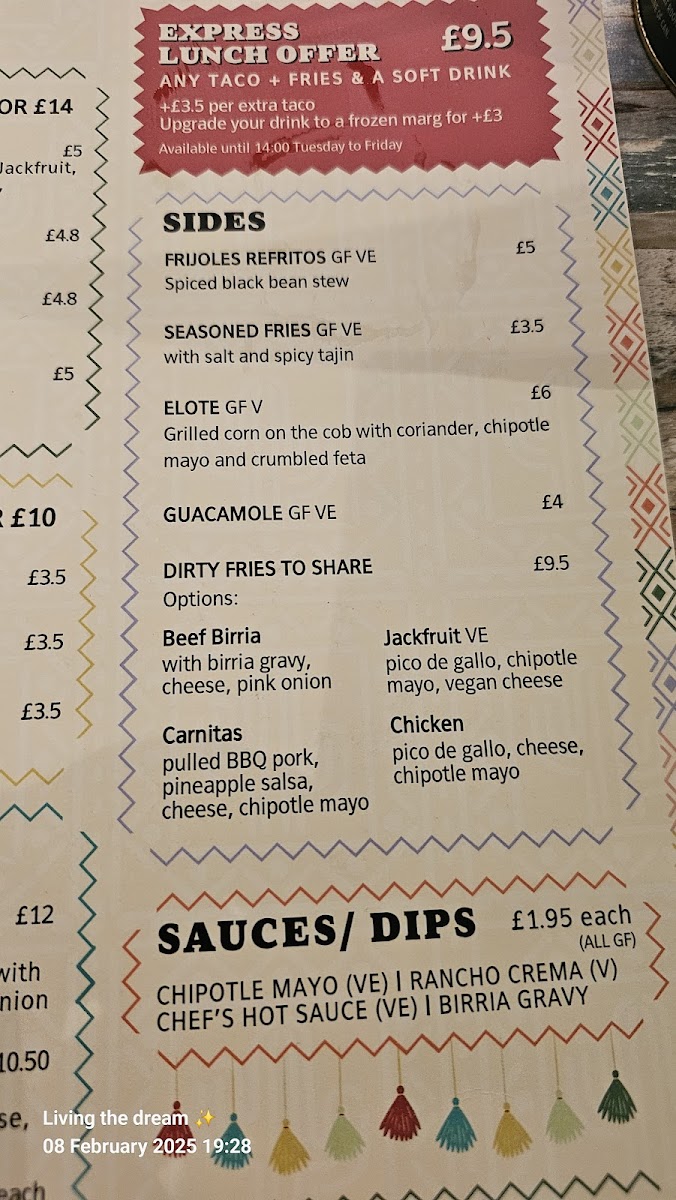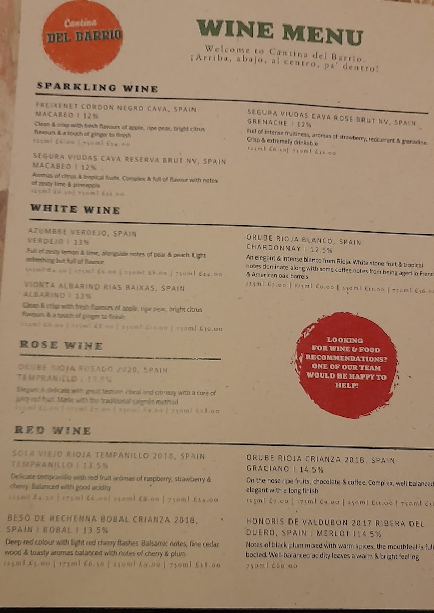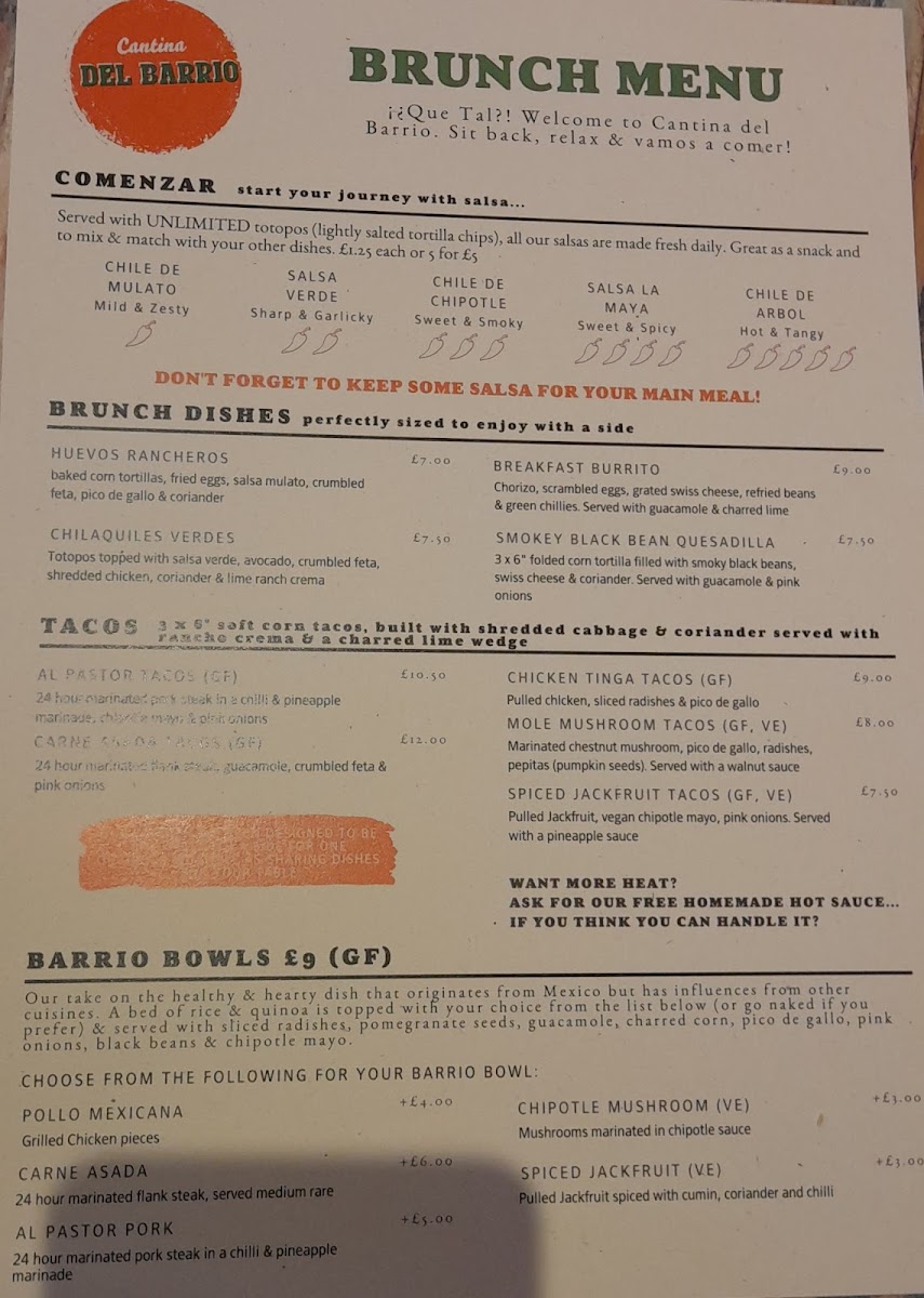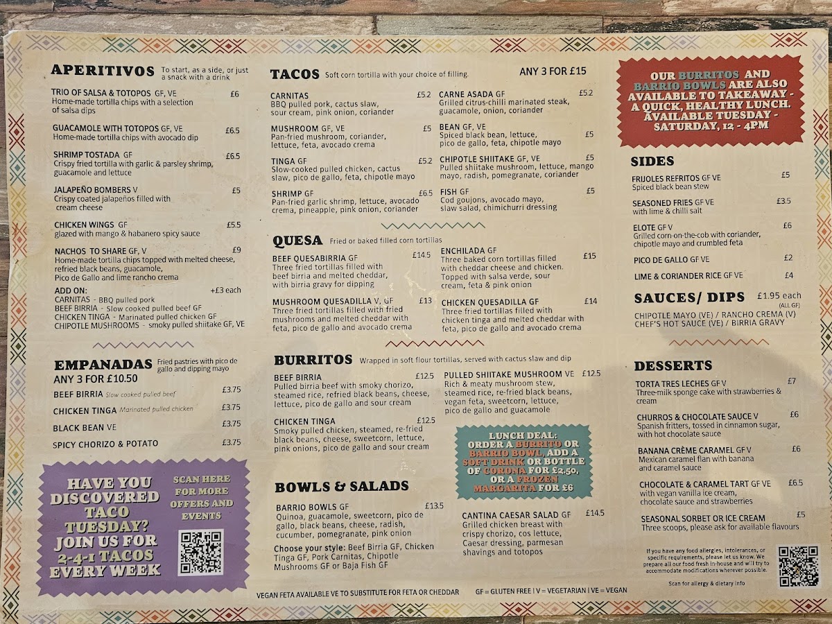 Cantina Del Barrio offers a vibrant and diverse menu with a range of mouthwatering dishes and refreshing drinks. For starters, the Trio of Salsa & Totopos (GF, VE) and Guacamole with Totopos (GF, VE) are popular choices, alongside Shrimp Tostada (GF) and Jalapeño Bombers (V). The taco selection features flavorful options like Carnitas, Carne Asada (GF), and Mushroom (GF, V), while the quesadillas include Beef Quesabirria (GF) and Chicken Quesadilla (GF). Those looking for something hearty can enjoy a Burrito, with fillings such as Beef Birria and Pulled Shiitake Mushroom (VE). For sides, the Frijoles Refritos (GF, VE) and Seasoned Fries (GF, VE) perfectly complement any meal. To wash it down, the drink menu features a range of Margaritas, including the Classic Margarita and Mezcaritapicante. There’s also a selection of cocktails like the Paloma and Espresso Martini, and for beer lovers, options such as Victoria Malaga Lager and Corona Extra are available. Don’t miss out on the Torta Tres Leches (GF, V) or Churros & Chocolate Sauce (V) to end your meal on a sweet note. Whether you’re looking for a refreshing drink or a tasty bite, Cantina Del Barrio has something to satisfy every craving.
