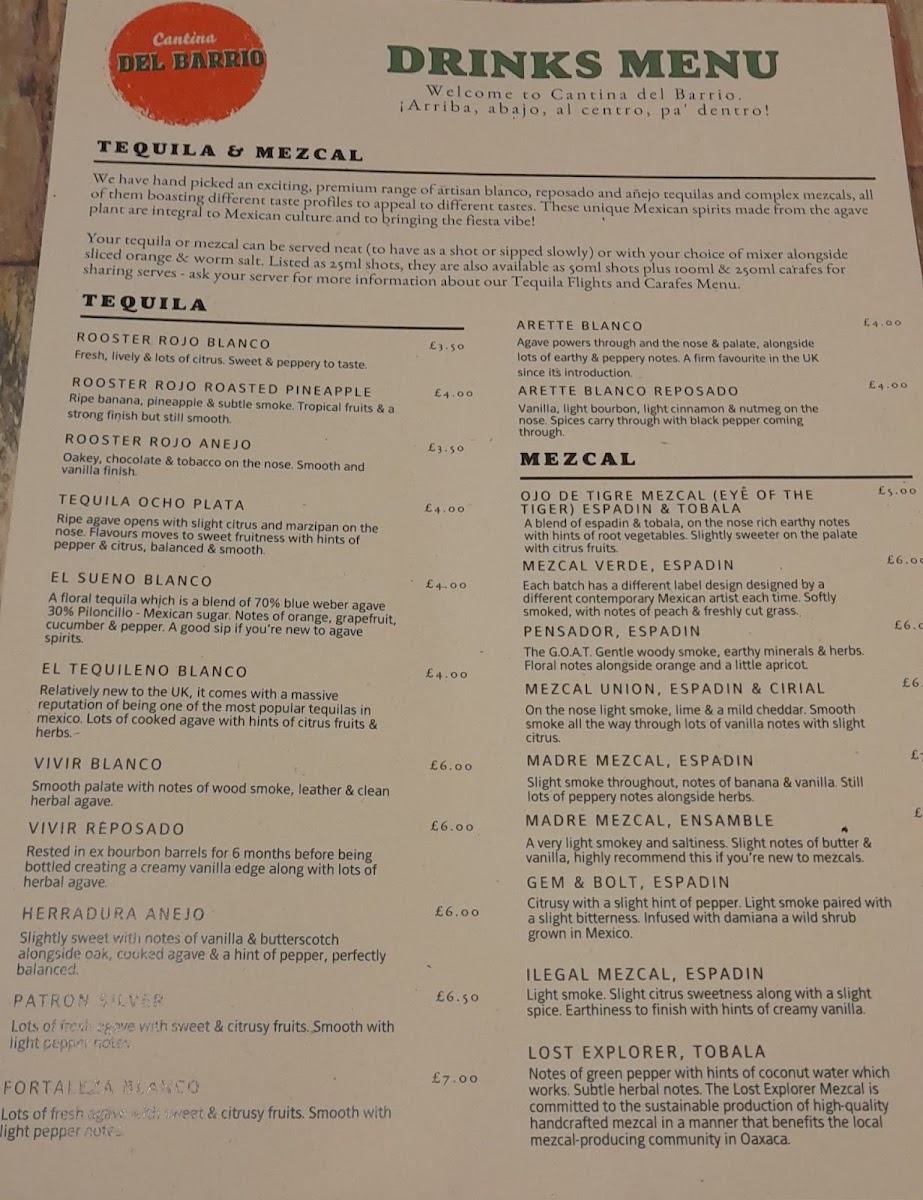 42%, Gentle smoke and earthy aromas, with fresh fruit & citrus on the palate. Try a flight of all four of the above for £15. All tequilas & mezcals served by the 25ml