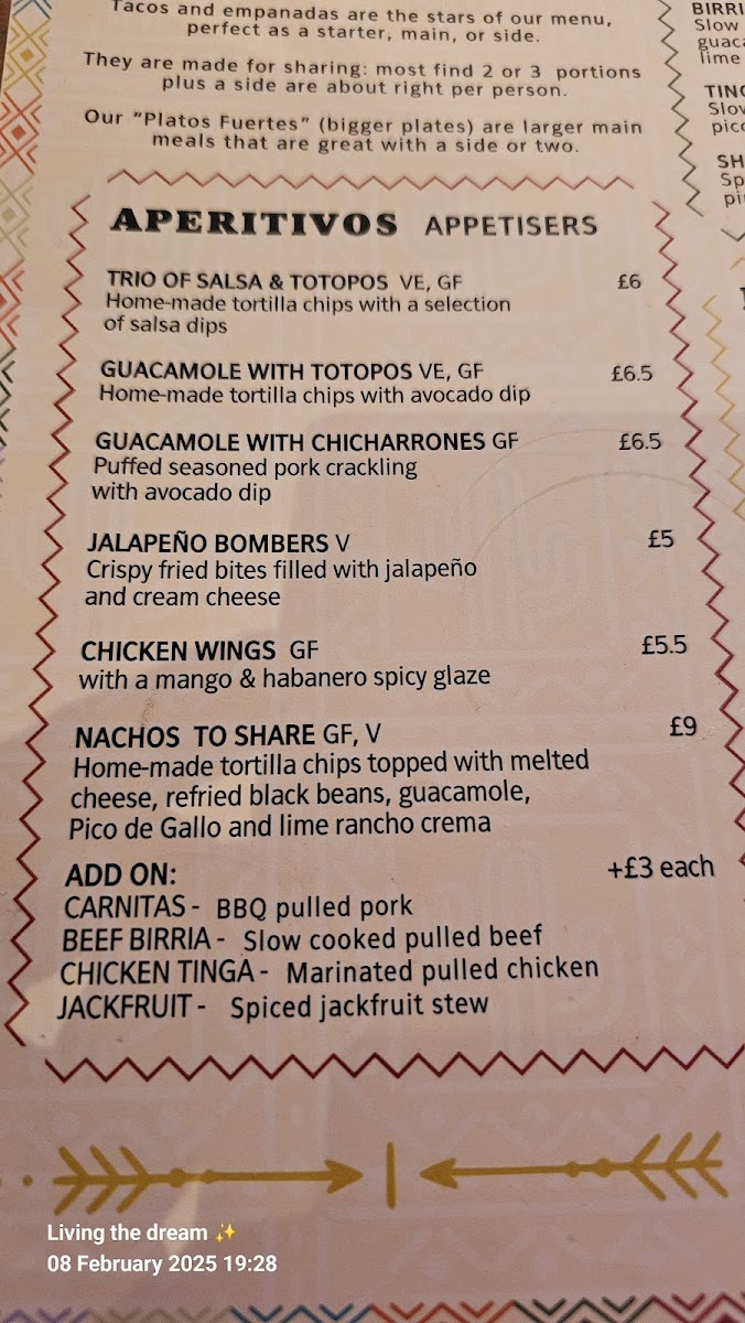 Home-made tortilla chips topped with melted cheese, refried black beans, guacamole, Pico de Gallo and lime rancho crema (Add Beef Birria, Chicken Tinga, Pork Carnitas or Chipotle Mushrooms for £3)